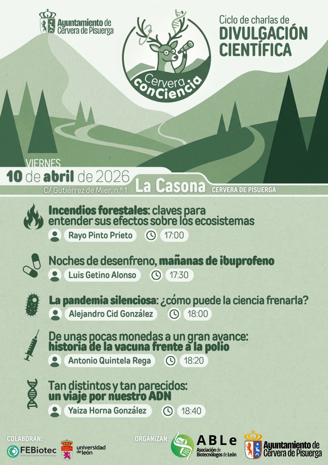 Este viernes, día 10 de abril, en la Casona de Cervera de Pisuerga, a las 17:00 horas, dará comienzo «CerveraConCiencia», un ciclo de charlas de divulgación científica que busca acercar al público el conocimiento científico general y la labor de la investigación técnica particular que se realiza en el mundo académico. Los ponentes de estas cinco charlas serán, por un lado, dos investigadores de la Universidad de León y, por otro, tres miembros de la Asociación de Biotecnólogos de León (ABLE). En cuanto a los dos primeros, ambos pertenecen a la Faculta de Ciencias Biológicas y Ambientales. Son Rayo Prieto, investigador predoctoral en el grupo de ecología aplicada y teledetección, que estudia el comportamiento de los incendios forestales y cómo estos impactan al ecosistema en el que se diseminan, de lo cual hablará en su charla; y Luis Getino, doctor en biología molecular, que hablará de los mecanismos celulares que afectan a nuestro organismo cuando nos excedemos con el consumo de alcohol. Los otros tres ponentes son estudiantes o egresados del grado en biotecnología de la Universidad de León, que hablarán acerca de diferentes cuestiones como el riesgo del mal uso de los antibióticos o los secretos que guarda nuestro ADN.